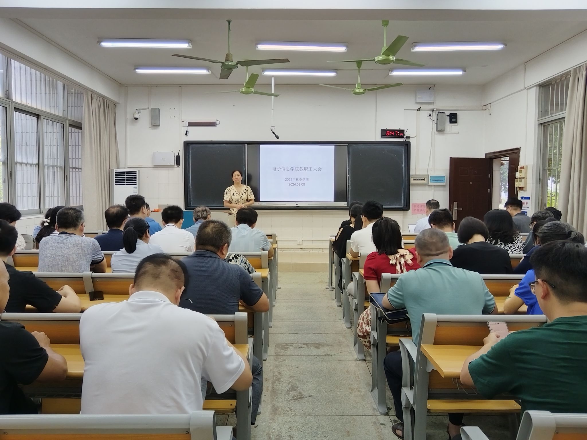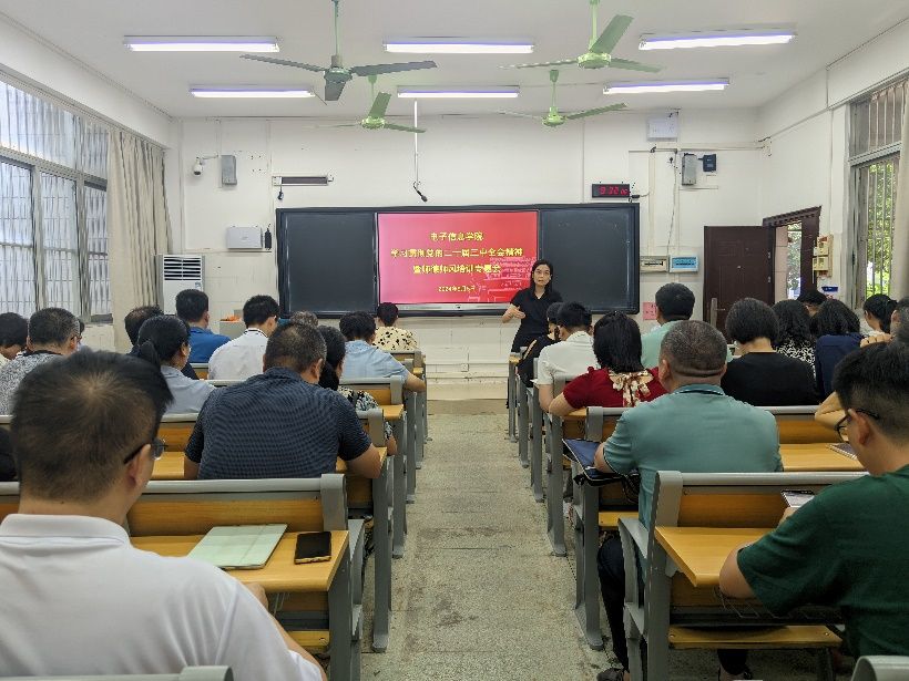 9月5日上午,电子信息学院在校友楼105召开2024年秋季学期教职工大会,学院党委书记张婧,学院党委副书记、院长罗丽平,学院党委副书记、纪委书记罗少科,副院长文春明、卢振坤以及学院全体教职工参加会议。会议由罗丽平主持。