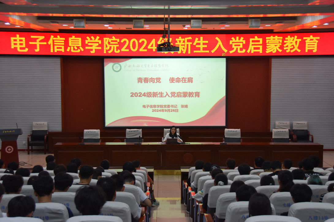 9月26日晚,电子信息学院党委在科技楼报告厅分两批开展2024级新生入党启蒙教育,学院党委书记张婧主讲,2024级550余名新生参加。