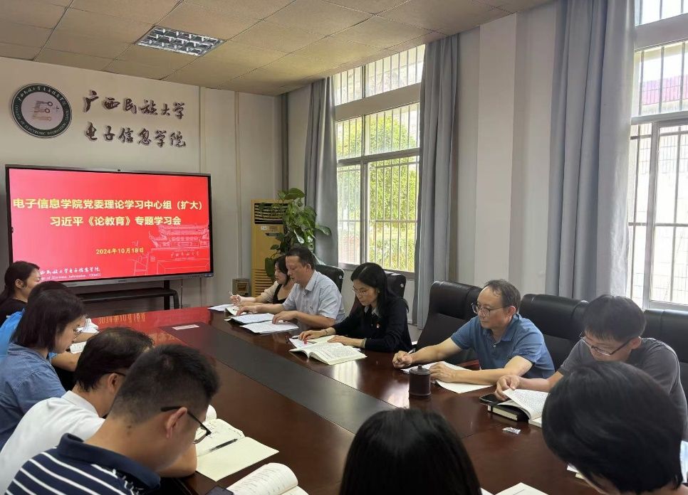 10月18日下午,电子信息学院党委召开理论学习中心组(扩大)会议,专题学习习近平同志《论教育》。学院党委书记张婧主持会议,学院党委副书记、纪委书记罗少科,学院副院长文春明、卢振坤等中心组成员参加会议并做交流发言,党支部书记、系主任参会。