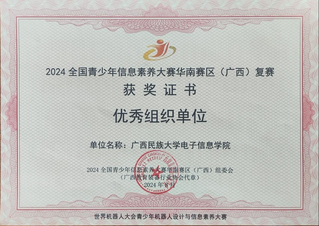 在本次大赛中,我院承办了2024全国青少年信息素养大赛华南赛区(广西)复赛图形化组、算法创意组、智能算法组、Gandi协作组、迷宫寻宝AI组的比赛,共组织556名选手参赛,学院也由此获得2024年全国青少年信息素养大赛华南赛区(广西)复赛优秀组织奖,获批为全国青少年等级考试服务网点、全国青少年电子信息科普创新教育基地。(初审:李旭  复审:梁翠凤  终审:罗少科)