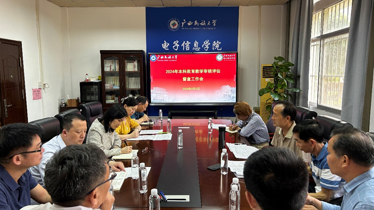4月3日下午,学校本科教育教学审核评估督查一组和教学督导一组李尚平、韦可春、王诤、黄开连一行4人到学院实地督查本科教育教学审核评估工作落实情况。电子信息学院全体领导及教学管理相关人员陪同。